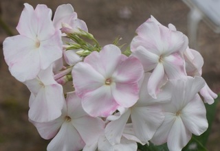 4,0-4,2; 70-75; С. Цветок колесовидной формы, лепестки шелковистые, белые с нежно-розовыми разводами, бутоны перламутрово-розовые. Соцветие округло-коническое, плотное. Куст прочный, мощный, быстро разрастается. Назначение универсальное. (Описание автора).