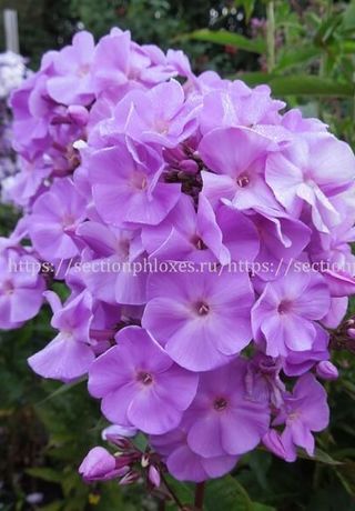 Цветок диаметром 3,5 см; днём густо-сиреневый, ровного тона; утром, вечером и в прохладную погоду сиренево-голубой. Лепестки слегка волнистые. Соцветие овально-коническое, средней величины, плотное. Куст высотой 70-80 см, полураскидистый. Стебли коричневые, более тёмные в верхней части. Устойчивый к грибным болезням сорт. Срок цветения средний. (Из каталога Секции, изд.: 2010, 2014).