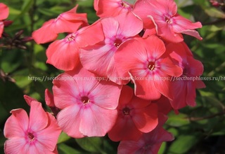 Цветок диаметром 3,8-4,0 см; густо-кораллово-розовый с белым центром. Соцветие широкопирамидальное, среднего размера, плотное. Куст высотой 60-70 см, полураскидистый, прочный. Зимостойкий, устойчивый к грибным болезням сорт. Срок цветения средний. (Из каталога Секции, изд.: 2010, 2014).