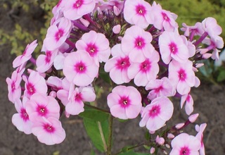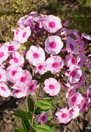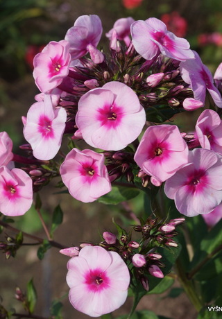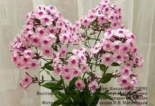 Цветок колесовидной формы диаметром 3,5 см; розовый с ярким карминным широким кольцом. Соцветие коническое с выступами, большое, плотное. Куст высотой 135 см, прямостоячий, быстро разрастается. Срок цветения среднепоздний. (Из каталога Секции, изд. 2014).