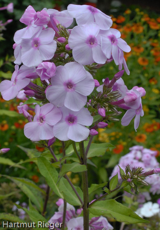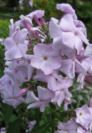 Цветок диаметром 3,0-3,5 см; бледно-сиреневатый холодного тона с пурпурно-розовым колечком в форме звёздочки. Бутоны и трубка цветка пурпурно-розовые. Соцветие округло-коническое, крупное, плотное. Куст высотой 110-130 см. Стебли тонкие, но прочные. Листья слегка опушённые, поэтому выглядят сероватыми. Срок цветения среднепоздний. (Наша редакция).