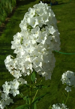 Размер цветка 2,2 см, высота куста 90-100 см, срок цветения средний. Чисто белый, с белыми бутонами и трубкой. Цветок слегка вогнутый с треугольными краями лепестков. Лепестки очень плотной фактуры. Соцветие большое удлиненное с множеством боковых выростов. Цветение продолжительное, при этом соцветие из ажурного становится все более плотным. Куст красивый, прямостоячий, крепкий. Очень нарядный, устойчивый, с высоким коэффициентом размножения. Назначение: универсальное. (Описание автора).