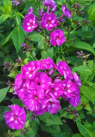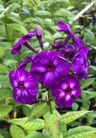 3,4-3,6; 55-60; СР. Цветок колесовидной формы, пурпурно-лиловый, с характерным жилкованием лепестков, которое придаёт цветку зрительный объём. При вечернем освещении и в пасмурную погоду приобретает синий оттенок. Не выгорает, не портится от росы. Соцветие среднего размера, округло-коническое, плотное. Куст прочный, мощный, быстро разрастается. Цветение обильное и продолжительное. Назначение – передний план цветника, бордюры. (Описание автора).