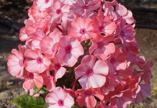 Цветок диаметром 4,0-4,4 см; кораллово-розовый с высветлением в центре и малиновым колечком; по мере цветения выцветает до белёсого. Соцветие округло-коническое, крупное, плотное. Куст высотой 70 см, компактный, прямостоячий. Срок цветения средний. (Наша редакция).