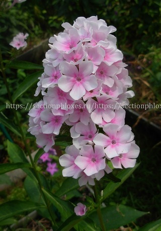 Цветок диаметром 2,2-2,4 см; бело-розовый, к центру темнее; от горловины тёмно-розовые лучики. Соцветие округло-коническое, плотное. Куст высотой 70-80 см, прямостоячий, прочный. Срок цветения средний. (Из каталога Секции, изд. 2014).