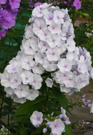 Цветок диаметром 4,5 см; бело-голубоватый с сиреневым колечком в виде звездочки. По мере цветение колечко исчезает. Соцветие округло-коническое, достаточно большое, плотное. Куст высотой 65-80 см, компактный, прочный. Срок цветения средний. (Из каталога Секции, изд. 2014).