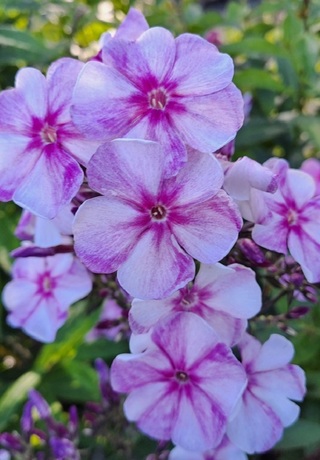 Цветок диаметром 3,2-3,5 см; сочетание сиреневого с белым: половинка лепестка и колечко в центре сиреневые; затем яркие цвета растекаются по венчику. Лепестки слегка волнистые. Соцветие округло-коническое с выступами, среднего размера и плотности. Куст высотой 100 см, полураскидистый, быстро разрастается. Срок цветения среднеранний. (Из каталога Секции, изд. 2014).