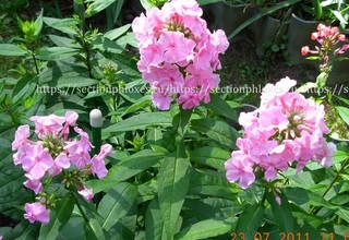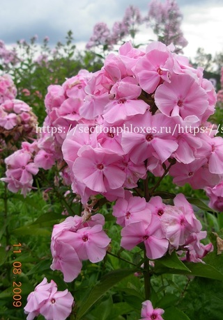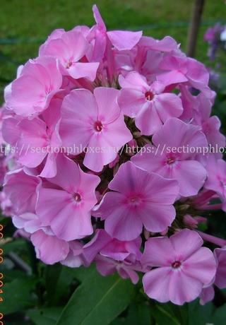 Цветок диаметром 3,8-4,0 см; светло-розовый, ровного тона; не выгорает на солнце. Трубка короткая. Соцветие округло-коническое, достаточно большое, очень плотное. Куст 50-60 см, компактный, полураскидистый, прочный. Зимостойкий, устойчивый к грибным болезням сорт. Срок цветения средний. (Из каталога Секции, изд.: 2010, 2014).