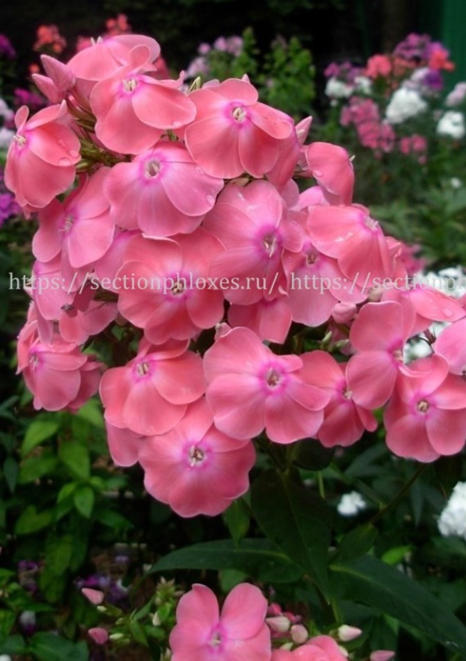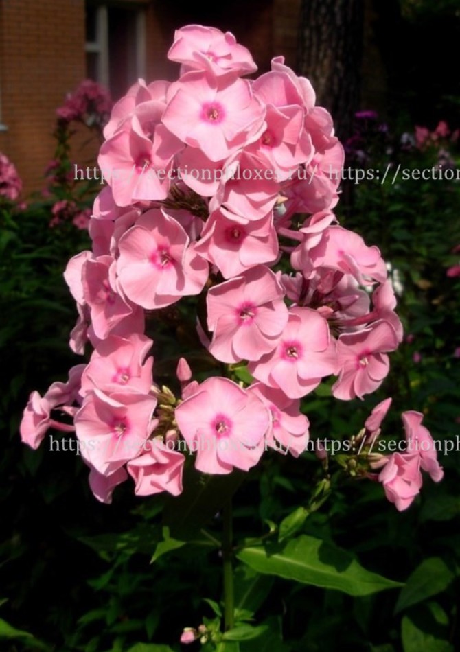 Теплый розовый с малиновым колечком. Цветок колесовидной формы. Соцветие округло-коническое, большое, плотное. Куст прямостоячий. Стебель зеленый. Листья зеленые. Зимостойкий.